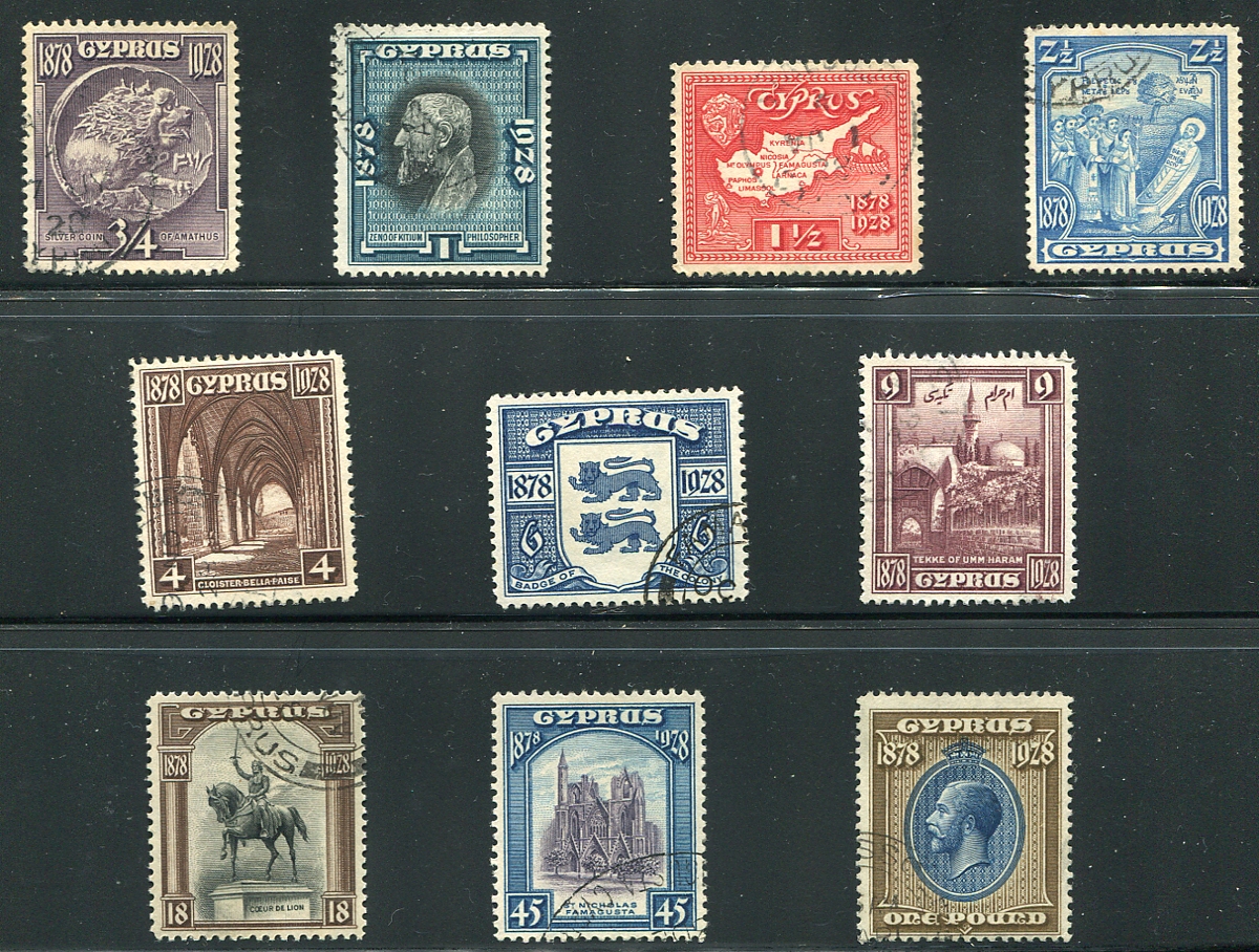 A complete used set of the gorgeous 1928 King George V set commemorating the 50th anniversary of Cyprus becoming a British Colony. Each with light, unobtrusive cancels. 2025 Scott US$355.60 =