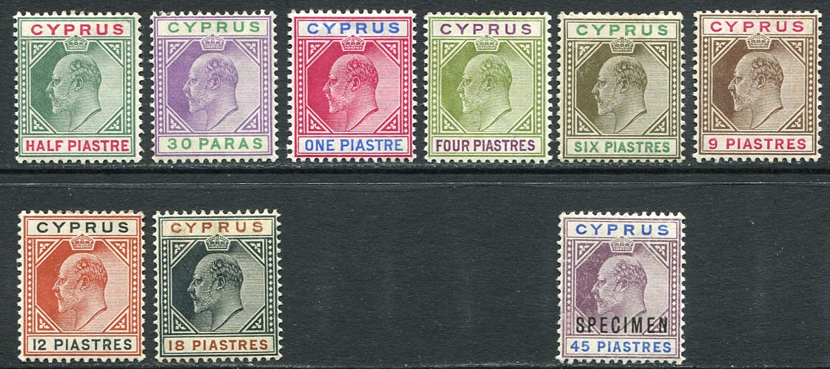 1903 King Edward VII definitive series, with eight out of the ten denominations, missing the 2pi and 45pi (Scott catalogue value US$462.00). There is a "Specimen" overprint on the 45pi (Stanley Gibbons £50.00). A fresh mint group, all hinged, a few quite lightly. Combined Scott / Gibbons catalogue value $716.70 CDN. Estimate =
