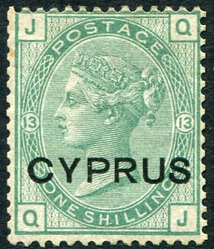 The key 1/- green value from plate #13 overprinted "Cyprus" from the first set from 1880. Fresh appearance, the stamp has no gum (we have catalogued it as the cheaper price for "used"). Has an extremely minor bit of toning and a faint owner’s mark on back. A terrific looking stamp. 2025 Scott US$525.00 =