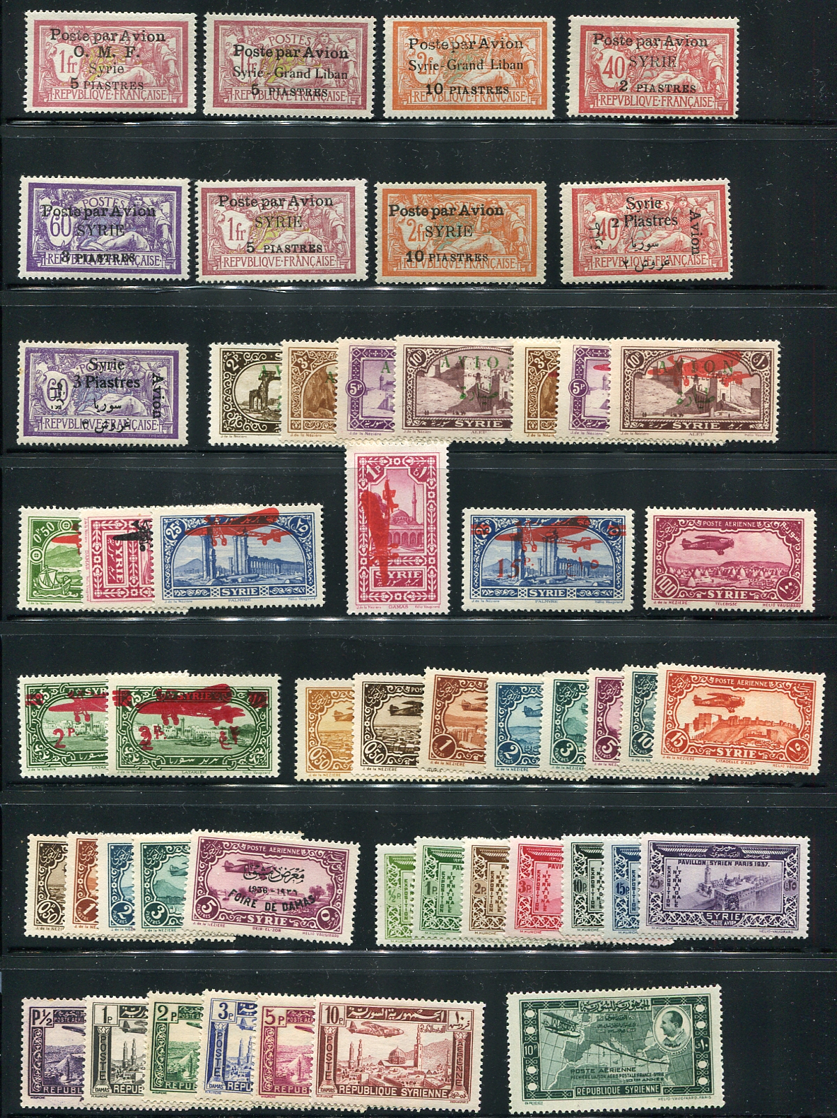 A couple of pages of mint airmail stamps from the overprinted issues to the mid-1950's. Most are complete sets, hinged, with fresh appearance. The basic issues catalogue US$484.15 and there are also two Scott-listed (but unpriced) overprint varieties (#C35b and #C45a) which add a pleasant complexity to this lot. Estimate =