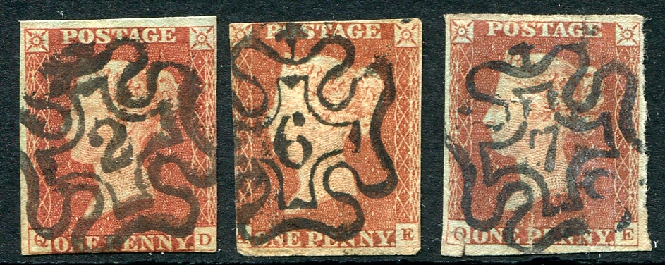A trio of imperforate "Penny Reds" with very clear Maltese Cross cancels with three different London numeral cancels, specifically "2", "6" and "7". A good start as there were only 12 numbers from this assignment. Owner's older 2017 Stanley Gibbons Concise £480.00 in Canadian dollars =