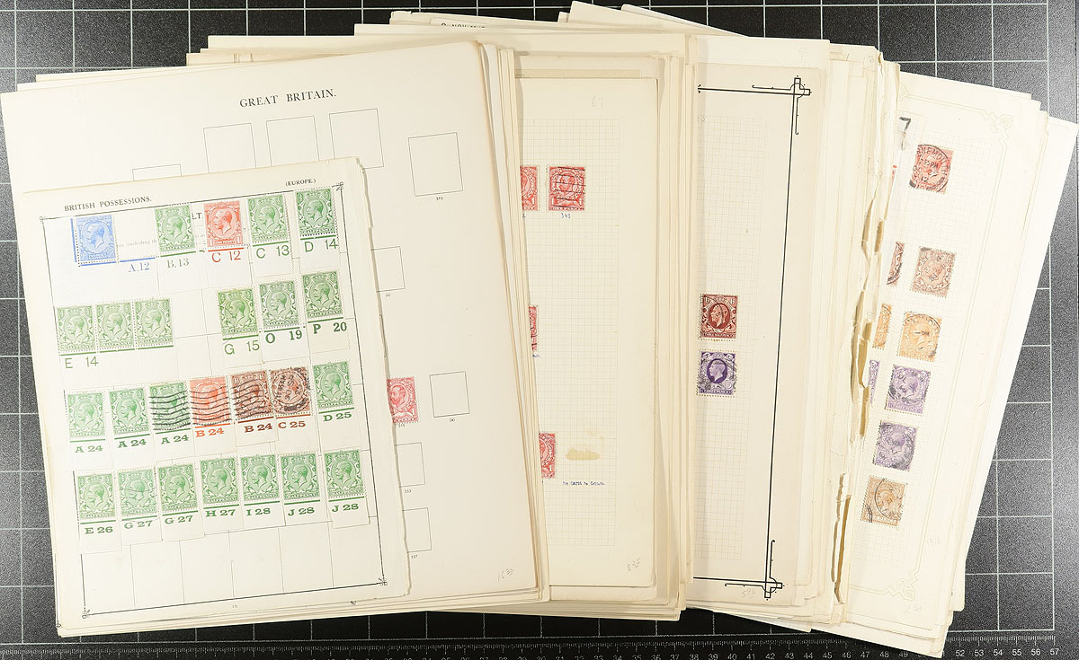 King George V estate balance of about 50 assorted album pages (from several collections) with a mix of mint and used, including something from each key KGV issue (e.g. 1911 definitives, Seahorses, British Empire Exhibition). A number of plate margin singles and pages laid out by Stanley Gibbons gives lots of opportunity for the specialist. Expect some duplication and maybe some hidden gems. Estimate =