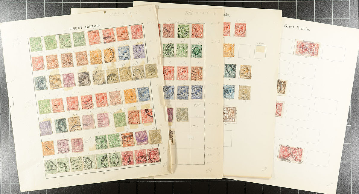 King George V estate balance of about 50 assorted album pages (from several collections) with a mix of mint and used, including something from each key KGV issue (e.g. 1911 definitives, Seahorses, British Empire Exhibition). A number of plate margin singles and pages laid out by Stanley Gibbons gives lots of opportunity for the specialist. Expect some duplication and maybe some hidden gems. Estimate =
