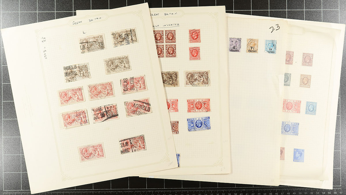 King George V estate balance of about 50 assorted album pages (from several collections) with a mix of mint and used, including something from each key KGV issue (e.g. 1911 definitives, Seahorses, British Empire Exhibition). A number of plate margin singles and pages laid out by Stanley Gibbons gives lots of opportunity for the specialist. Expect some duplication and maybe some hidden gems. Estimate =