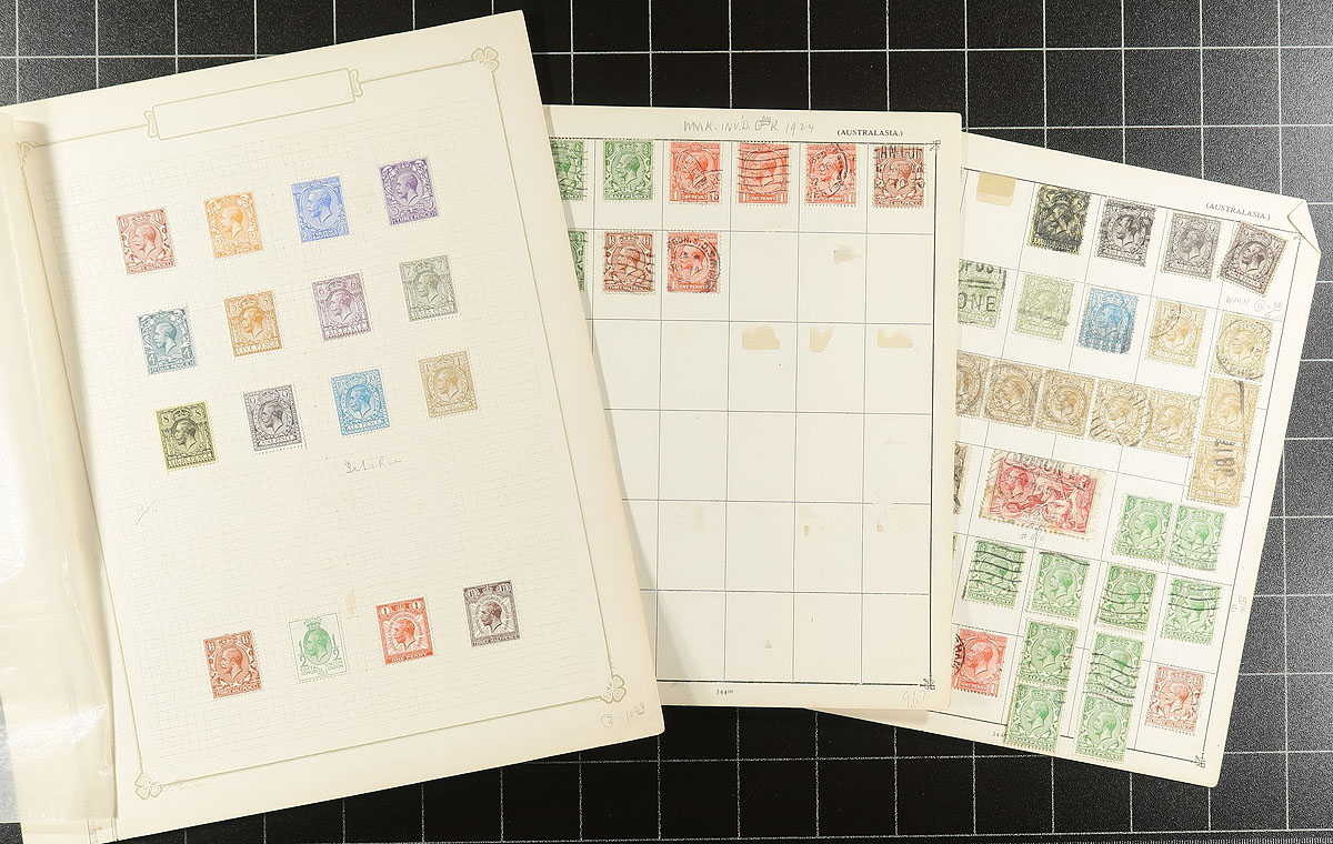 King George V estate balance of about 50 assorted album pages (from several collections) with a mix of mint and used, including something from each key KGV issue (e.g. 1911 definitives, Seahorses, British Empire Exhibition). A number of plate margin singles and pages laid out by Stanley Gibbons gives lots of opportunity for the specialist. Expect some duplication and maybe some hidden gems. Estimate =