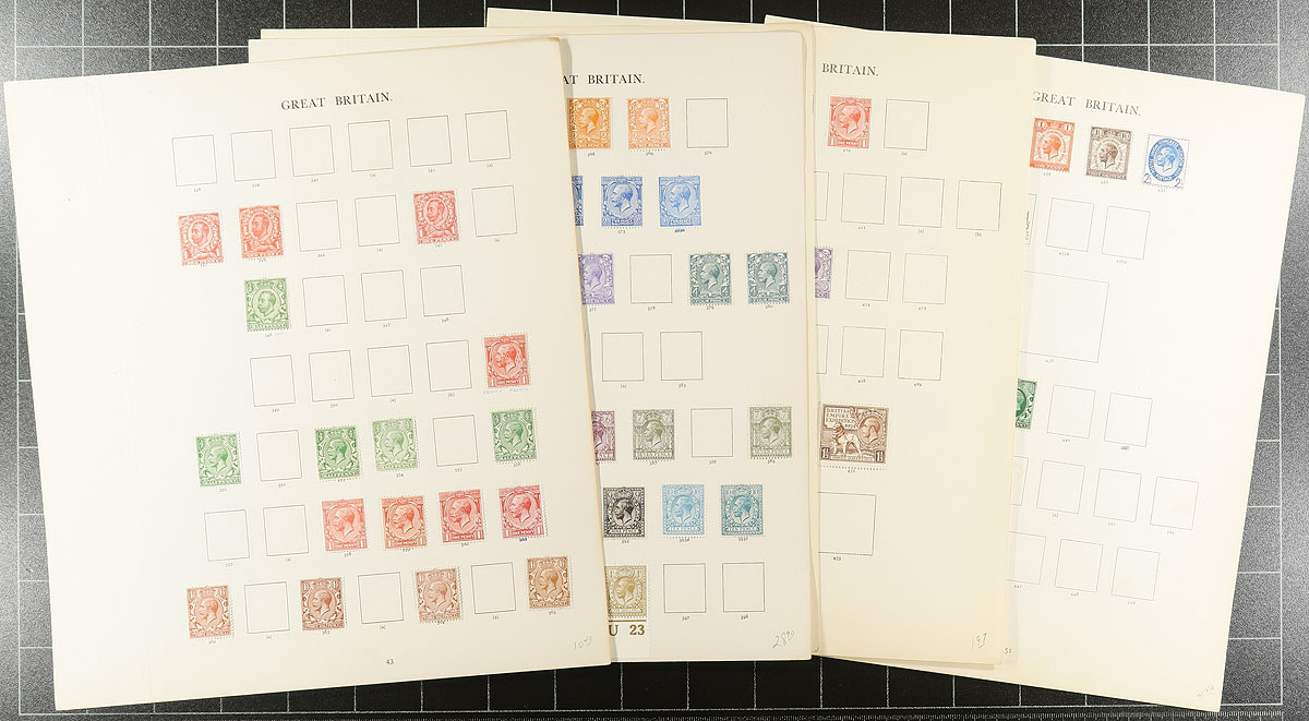 King George V estate balance of about 50 assorted album pages (from several collections) with a mix of mint and used, including something from each key KGV issue (e.g. 1911 definitives, Seahorses, British Empire Exhibition). A number of plate margin singles and pages laid out by Stanley Gibbons gives lots of opportunity for the specialist. Expect some duplication and maybe some hidden gems. Estimate =