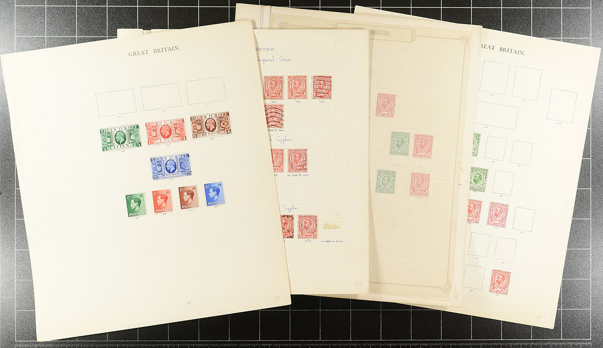 King George V estate balance of about 50 assorted album pages (from several collections) with a mix of mint and used, including something from each key KGV issue (e.g. 1911 definitives, Seahorses, British Empire Exhibition). A number of plate margin singles and pages laid out by Stanley Gibbons gives lots of opportunity for the specialist. Expect some duplication and maybe some hidden gems. Estimate =