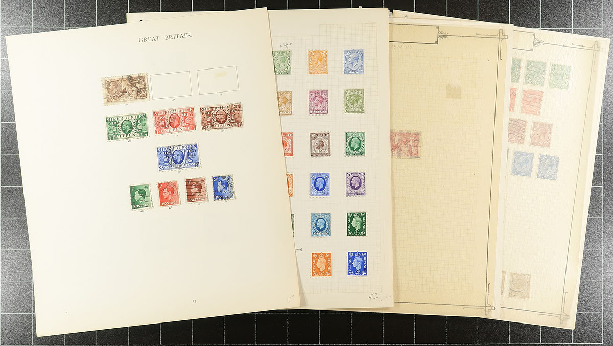 King George V estate balance of about 50 assorted album pages (from several collections) with a mix of mint and used, including something from each key KGV issue (e.g. 1911 definitives, Seahorses, British Empire Exhibition). A number of plate margin singles and pages laid out by Stanley Gibbons gives lots of opportunity for the specialist. Expect some duplication and maybe some hidden gems. Estimate =
