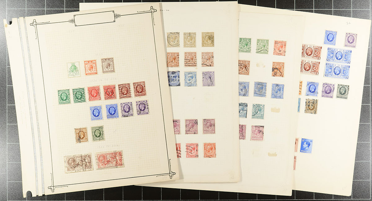 King George V estate balance of about 50 assorted album pages (from several collections) with a mix of mint and used, including something from each key KGV issue (e.g. 1911 definitives, Seahorses, British Empire Exhibition). A number of plate margin singles and pages laid out by Stanley Gibbons gives lots of opportunity for the specialist. Expect some duplication and maybe some hidden gems. Estimate =