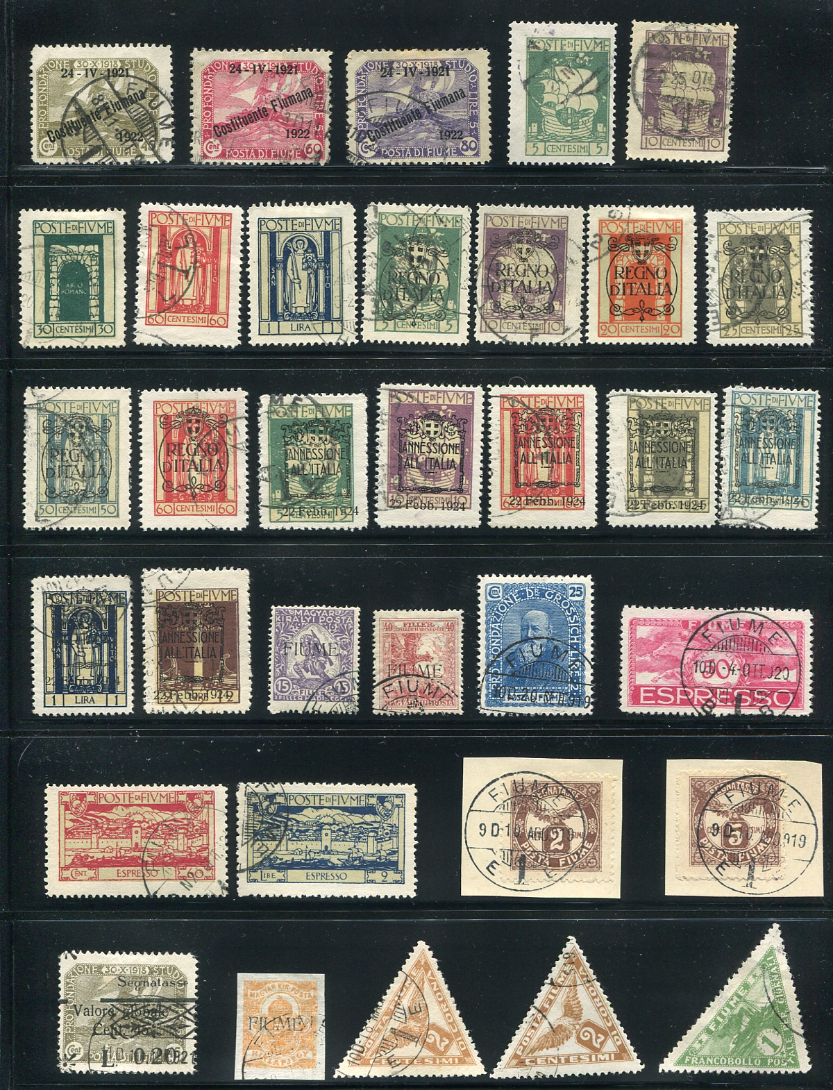 Two pages of used regular and back of the book issues giving a good overview of Fiume’s six years of producing its own stamps after the conclusion of the First World War. Lots of clean cancels, a couple are on piece. A very handsome group. Most catalogue $2-$10 per stamp. 2024 Scott US$446.55 =