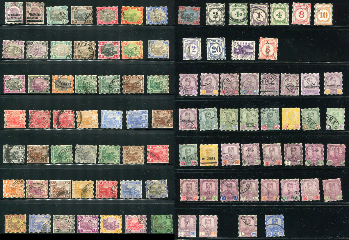 A striking selection of early Malaya and Johore state used issues, including a page of "Tigers", a few postage dues (these are hard to find used), a couple of Japan occupation issues ending with a half page of various "Sultans". Most with light postal cancels, good colour and intact perforations. There are individual items cataloguing up to $40.00 (e.g. Johore #45, #56, #109). A very difficult group to replicate. 2024 Scott US$565.15 =