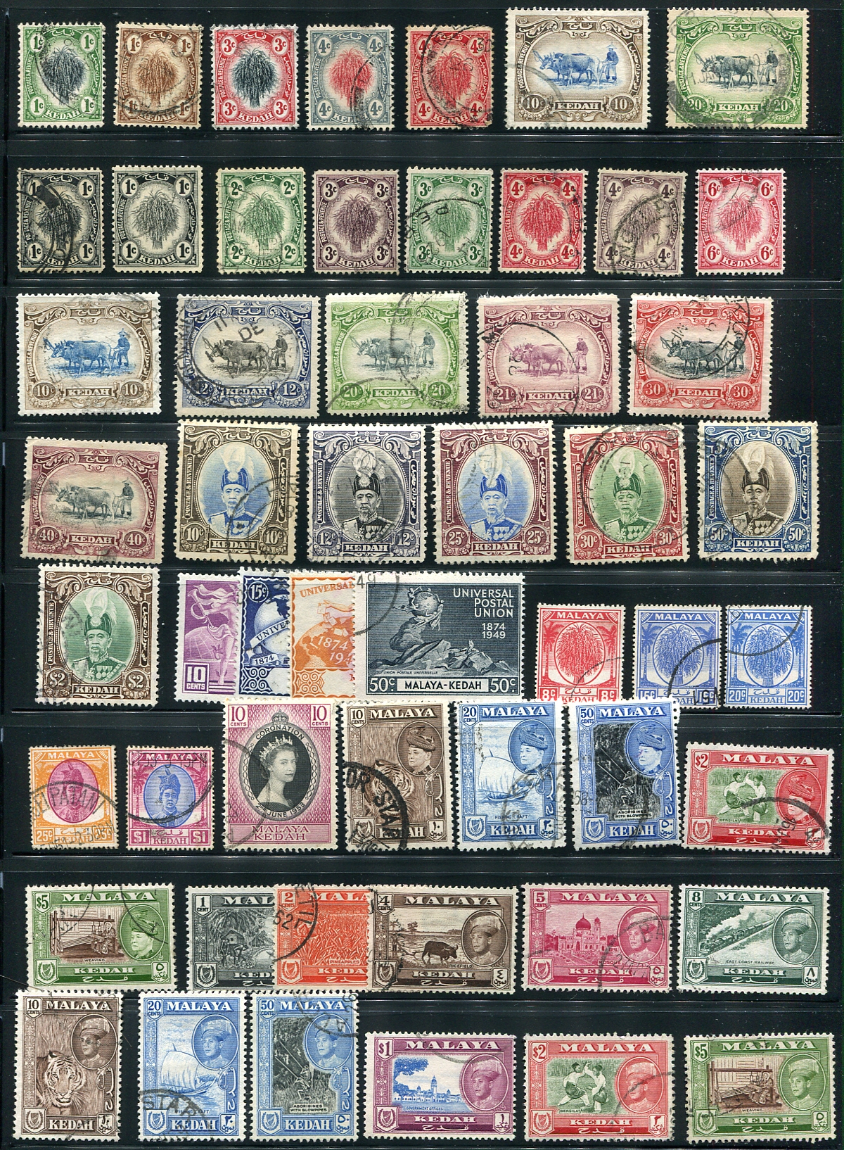 Difficult to find postally used page of this Malayan state, with a range of partial sets representing most issues, including those from the "Common Designs". Most with light cancels, and few visible faults. Better singles include #40, #53, #92, #92 and the last set #95-105. 2024 Scott US$417.60 =