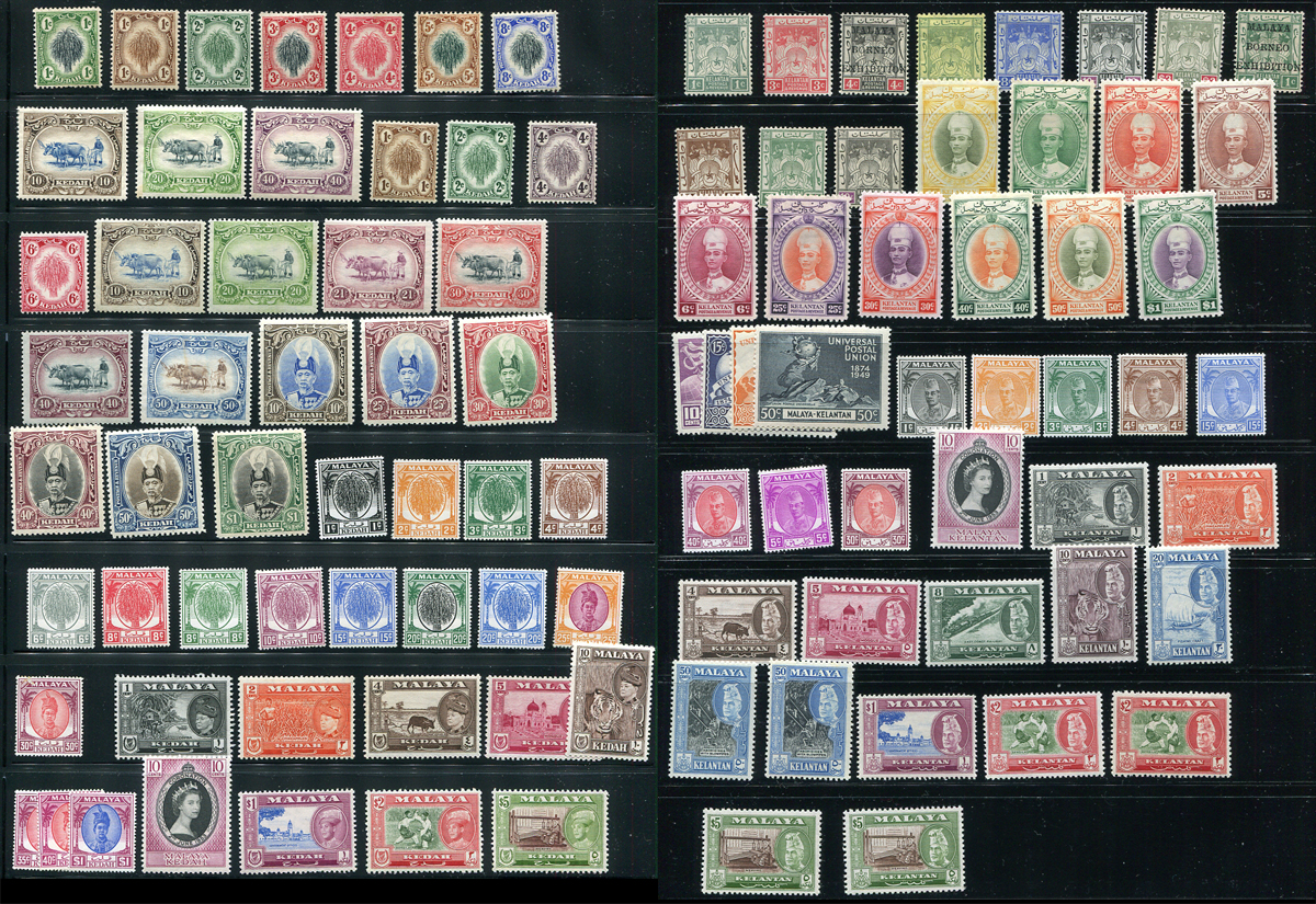 Two Malayan states on two pages of mint issues, with sets and partial sets, and the occasional perforation variant. Includes a number of singles from Kelantan’s Sultan Ismail set. Fresh appearance, only a couple of minor faults to be expected and individual stamps with catalogue values to $40.00. 2024 Scott US$647.95 =