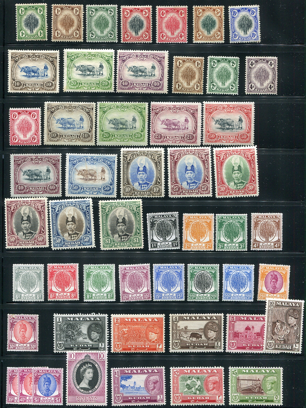 Two Malayan states on two pages of mint issues, with sets and partial sets, and the occasional perforation variant. Includes a number of singles from Kelantan’s Sultan Ismail set. Fresh appearance, only a couple of minor faults to be expected and individual stamps with catalogue values to $40.00. 2024 Scott US$647.95 =