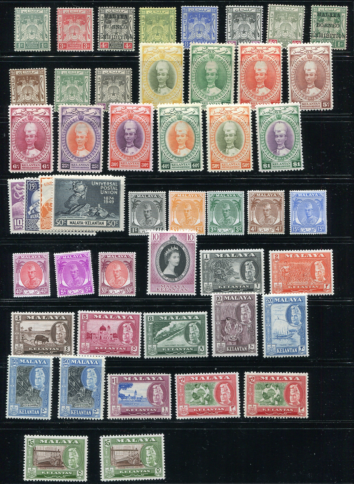 Two Malayan states on two pages of mint issues, with sets and partial sets, and the occasional perforation variant. Includes a number of singles from Kelantan’s Sultan Ismail set. Fresh appearance, only a couple of minor faults to be expected and individual stamps with catalogue values to $40.00. 2024 Scott US$647.95 =