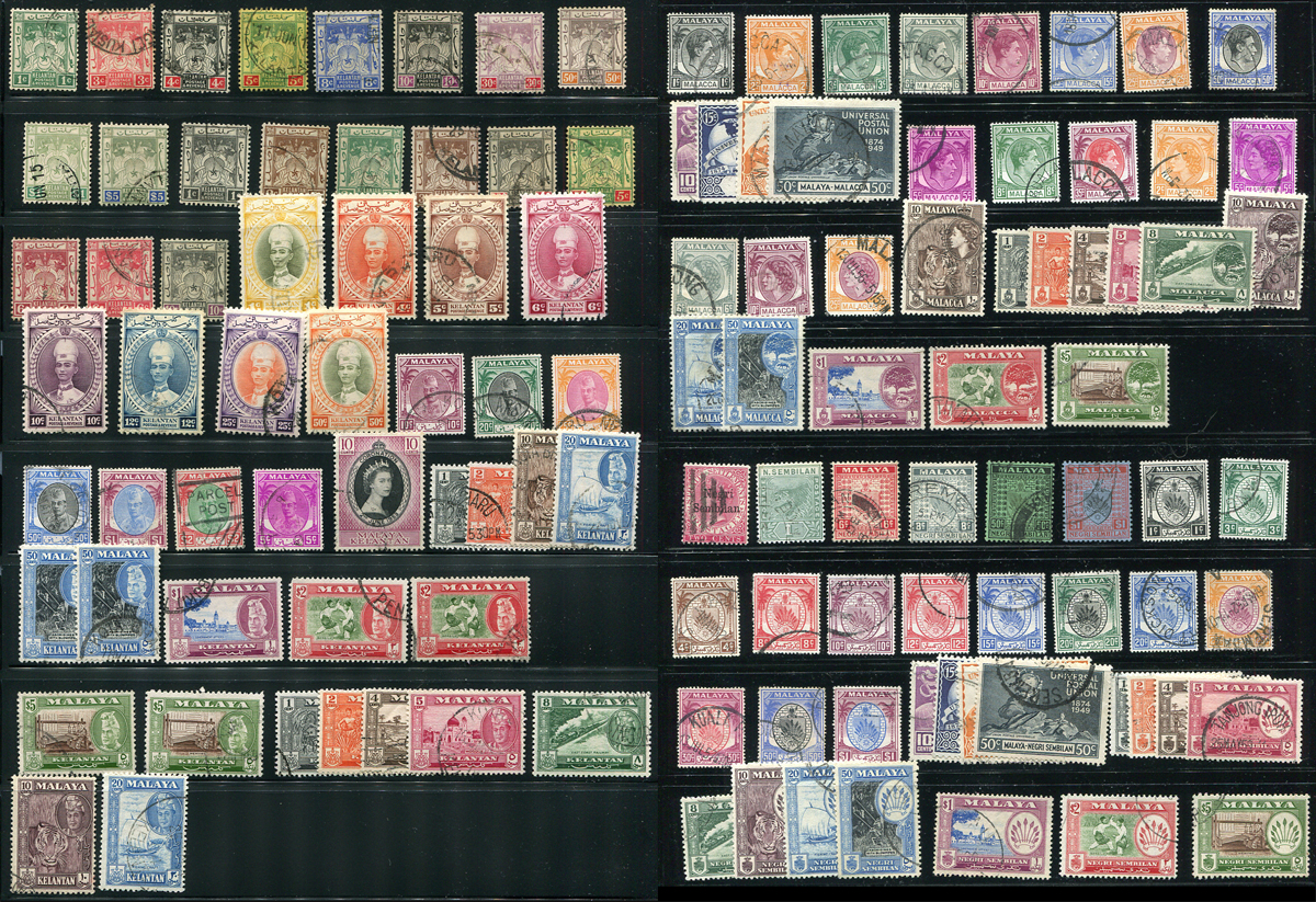 Kelantan (#1a/90), Malacca (#3/66) and Negri Sembilan (#1/74), Nice selection of used singles and sets from three Malayan States, with denominations to $5.00 and a few perforation variants throughout. The biggest chunk of catalogue value is from Kelantan (with #63), catalogues $347.05. Malacca and Negri Sembilan includes complete UPU and the final sets (catalogues $84.90 and $117.15, respectively). A fine two-page offering. Total 2024 Scott US$549.10 =