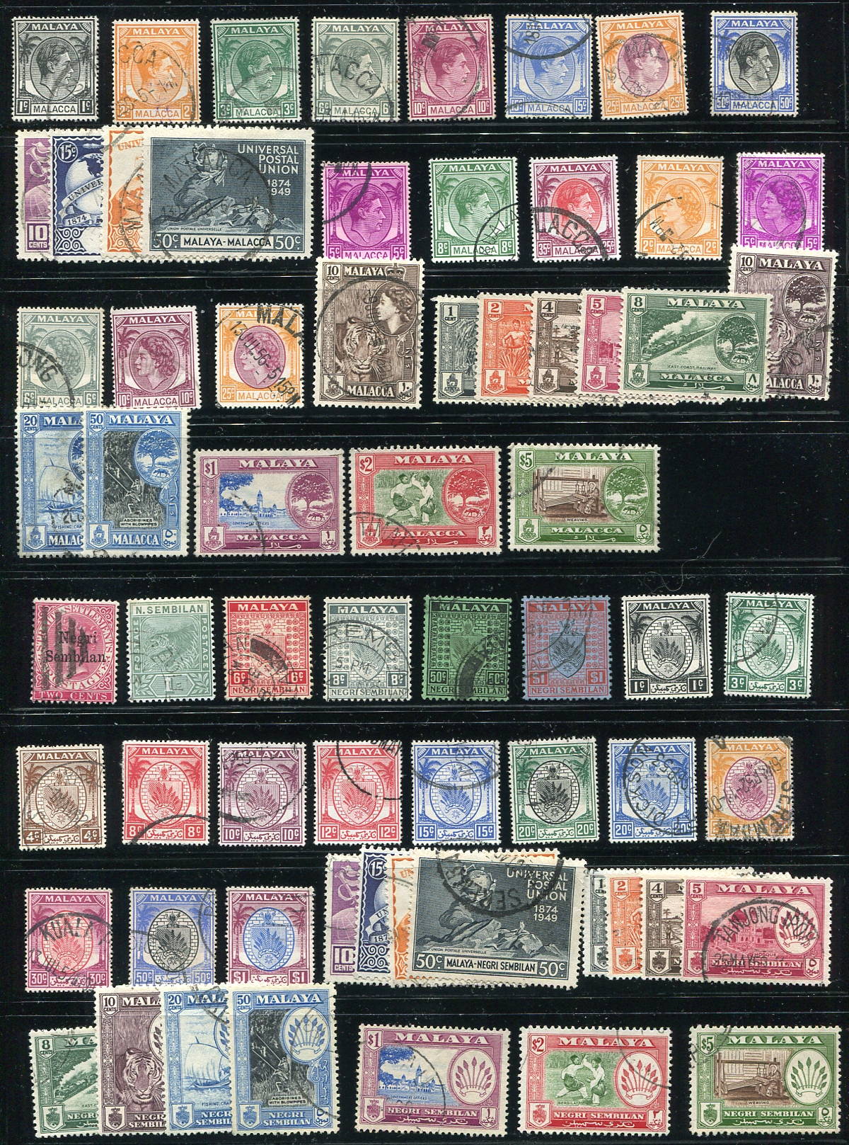 Kelantan (#1a/90), Malacca (#3/66) and Negri Sembilan (#1/74), Nice selection of used singles and sets from three Malayan States, with denominations to $5.00 and a few perforation variants throughout. The biggest chunk of catalogue value is from Kelantan (with #63), catalogues $347.05. Malacca and Negri Sembilan includes complete UPU and the final sets (catalogues $84.90 and $117.15, respectively). A fine two-page offering. Total 2024 Scott US$549.10 =
