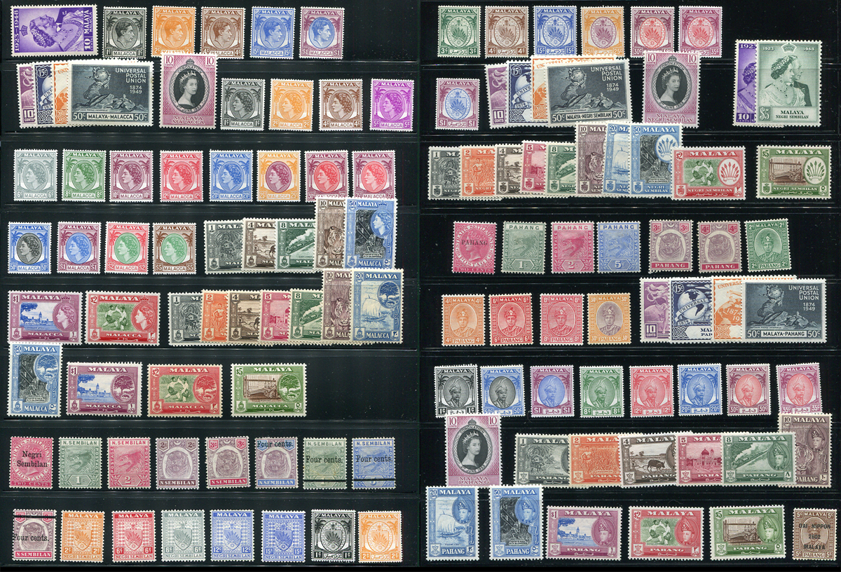 Malacca (#1/55), Negri Sembilan (#1/74) and Pahang (#4/82, N4). Mint selection from three Malayan states including a mix of singles and sets, with some "Common Design", overprints and a single Japanese occupation overprints. Lots of $5-$20 stamps throughout. Fresh appearance, decent centering and only a few are heavily hinged. No obvious faults at first blush. Value is fairly even split amongst the three states. Total 2024 Scott US$524.60 =