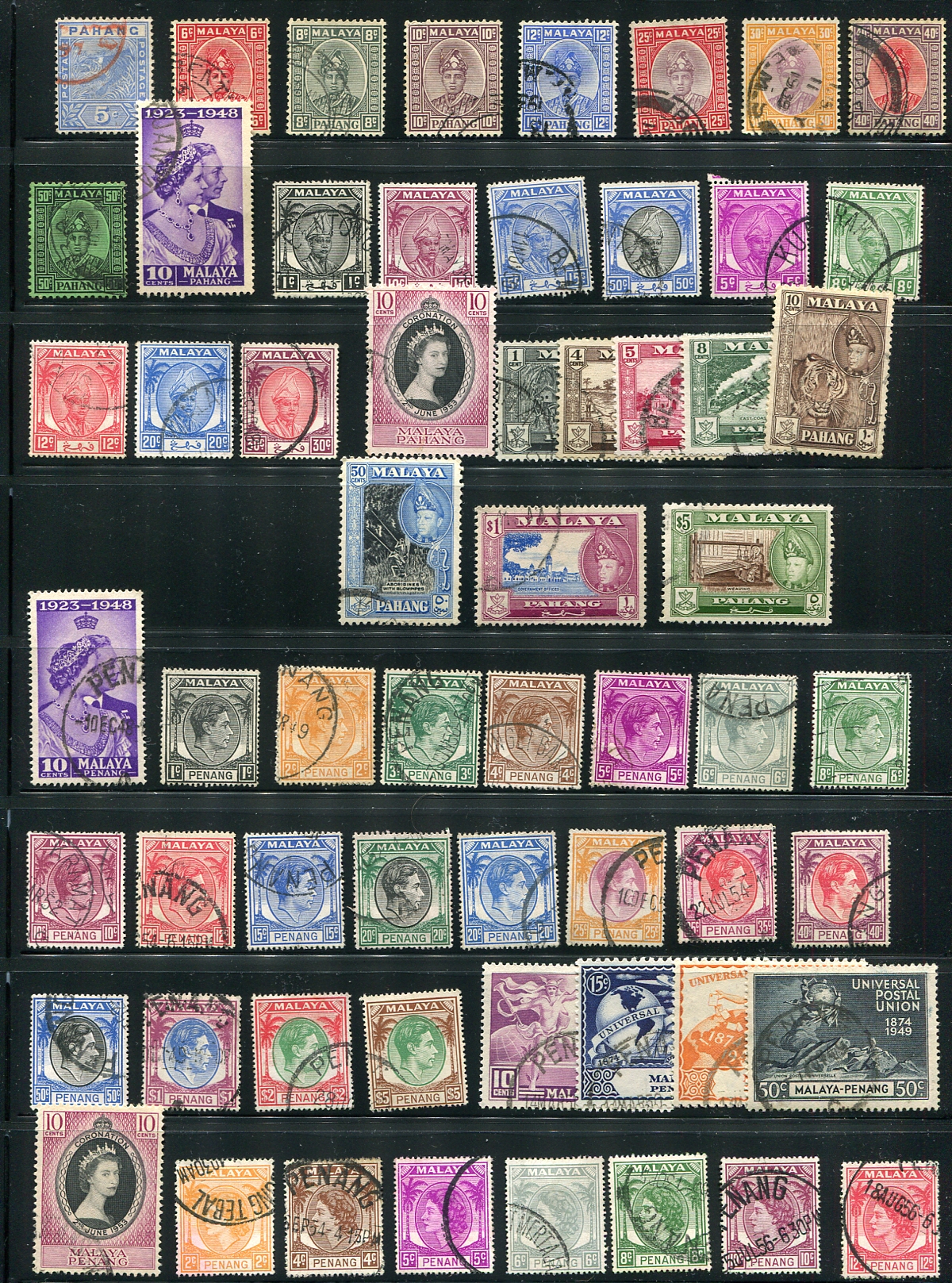 Pahang (#13/82a), Penang (#1/66) and Perak (#6/137a). Attractive two pages of used sets and singles from three Malayan States. Includes a number of $5.00 values, "Common Designs" throughout, with some perforation varieties and better singles with catalogue values to over $40.00 each. Pahang (cat $88.70), Penang (cat $151.50) and Perak (cat $177.85). Attractive and few faults. Total 2024 Scott US$418.05 =