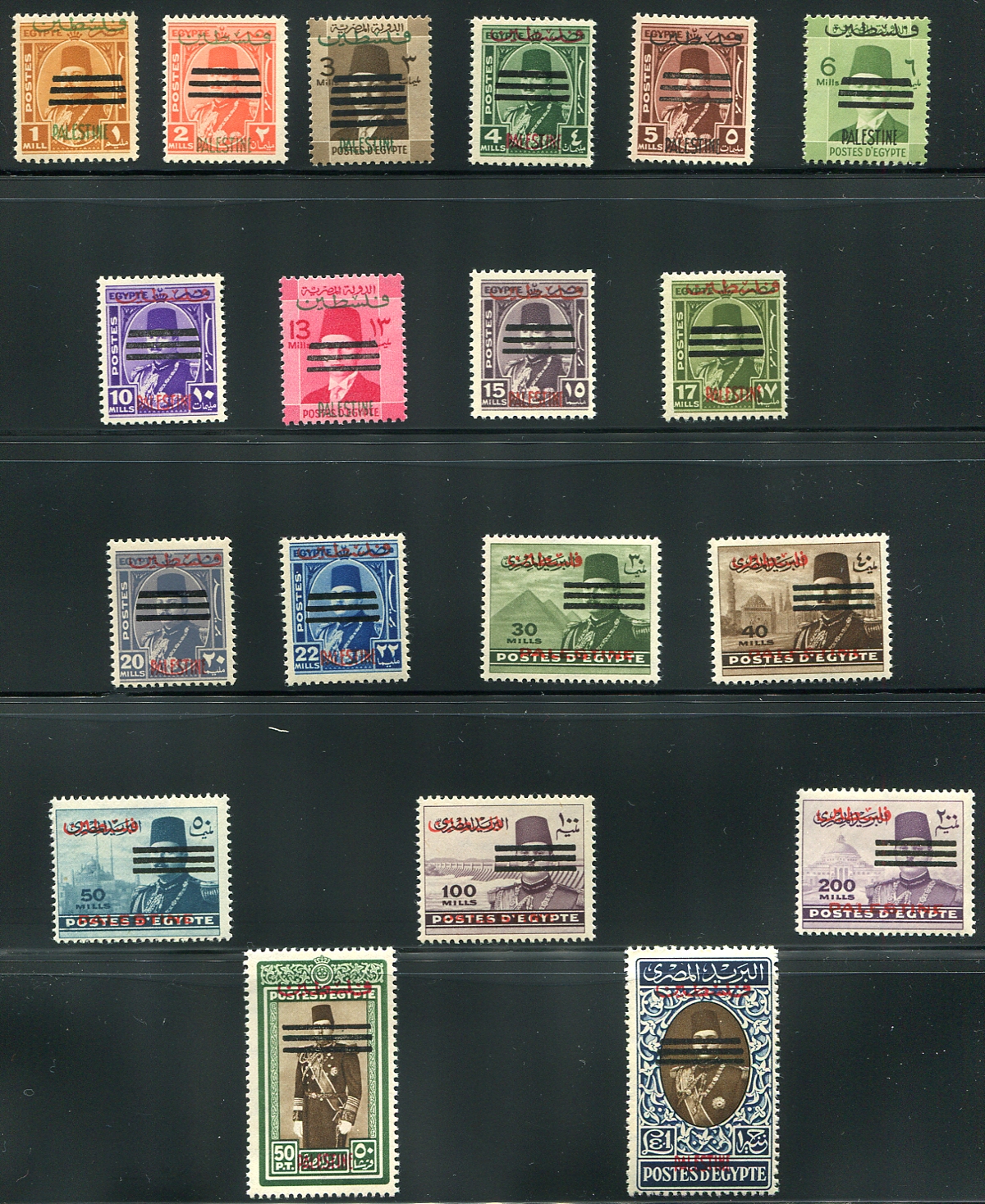 Compete mint Never Hinged set of the 1953 series of 19 stamps featuring the obliterated King Farouk stamps of Egypt with an additional overprint for use in Palestine. A fresh and key set! 2024 Scott US$329.55 =