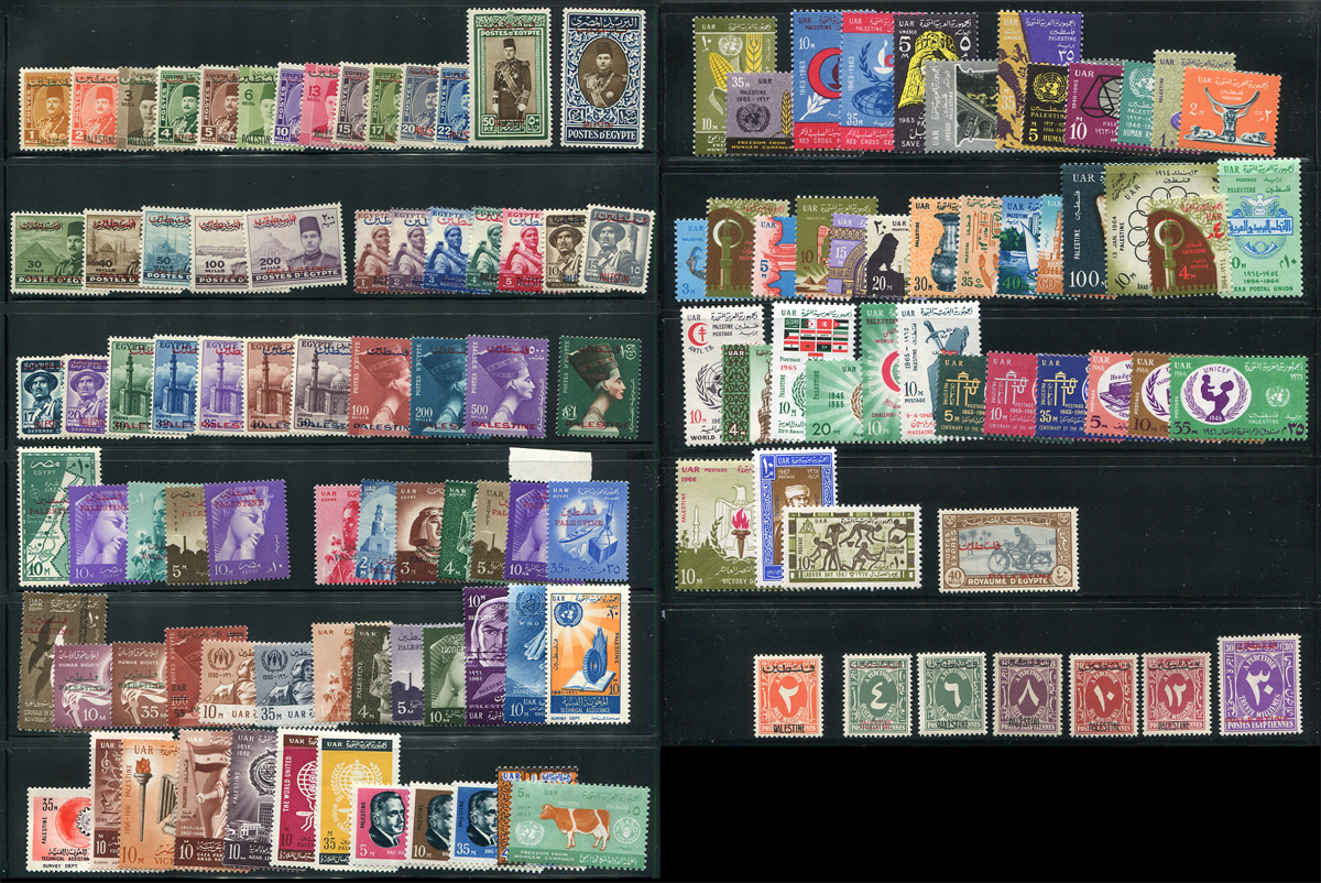 A near complete offering of mint issues of Egyptian occupied Palestine, missing only the 1953 set and the airmails (both being sold separately). All are attractive with most of the earlier issues being hinged and most of the more recent issues are never hinged. A good way to jump into this interesting corner of the philatelic world. 2024 Scott US$443.05 =