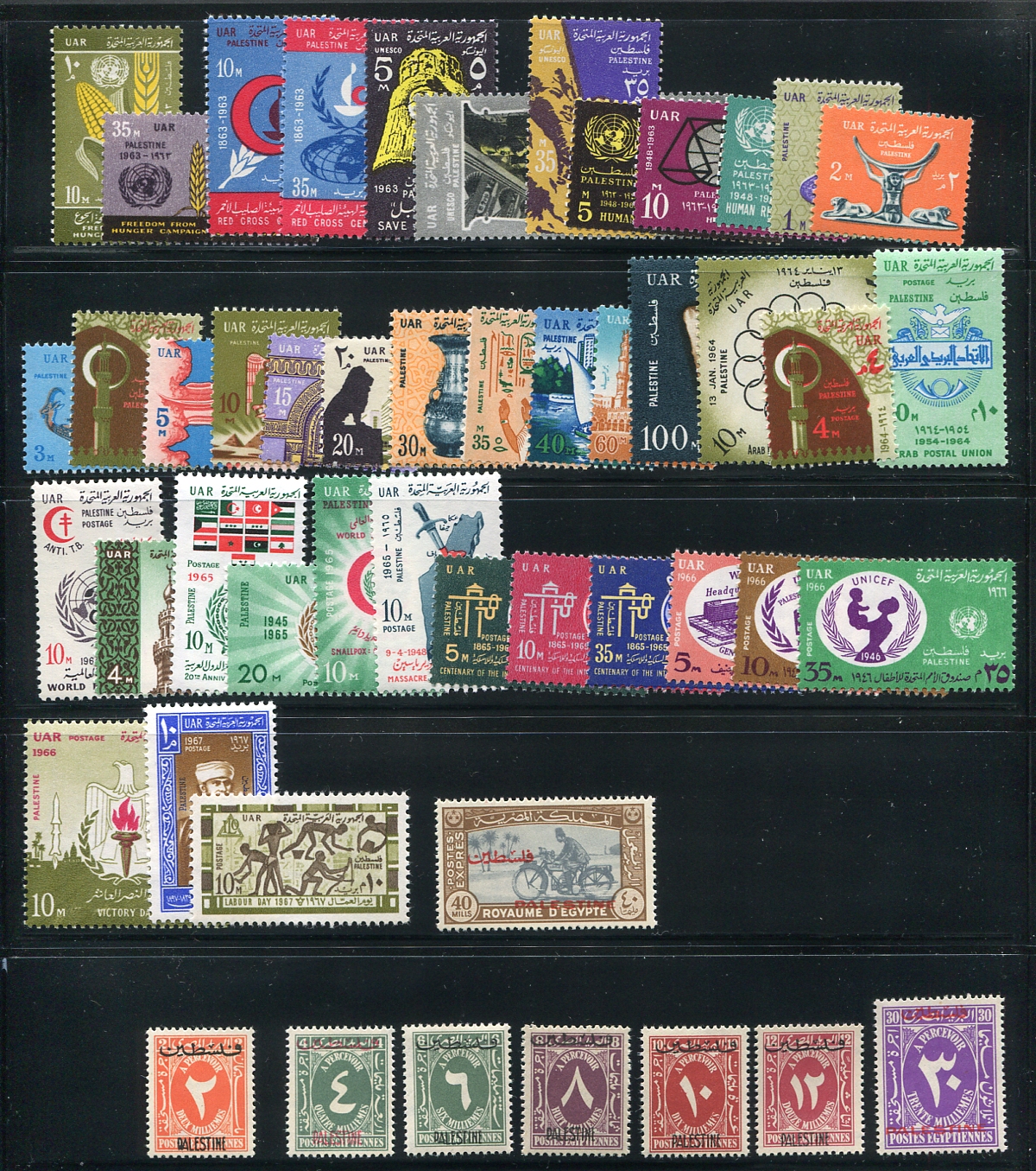 A near complete offering of mint issues of Egyptian occupied Palestine, missing only the 1953 set and the airmails (both being sold separately). All are attractive with most of the earlier issues being hinged and most of the more recent issues are never hinged. A good way to jump into this interesting corner of the philatelic world. 2024 Scott US$443.05 =