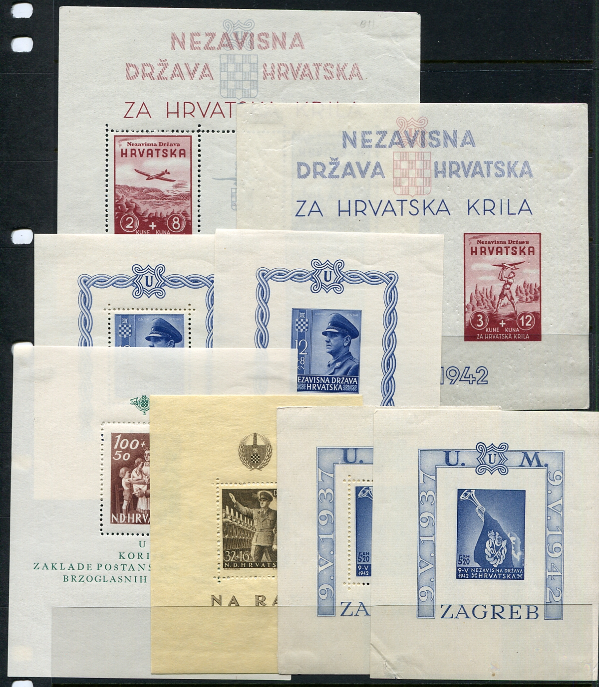 VF mint Hinged selection of 8 different souvenir sheets from the 1941-1945 period. Where there is matching design, it is for the perforated and imperforate examples (Scott sometimes assigns a separate number, but not always). A lovely group of WWII era souvenir sheets. 2026 Scott US$213.50 =