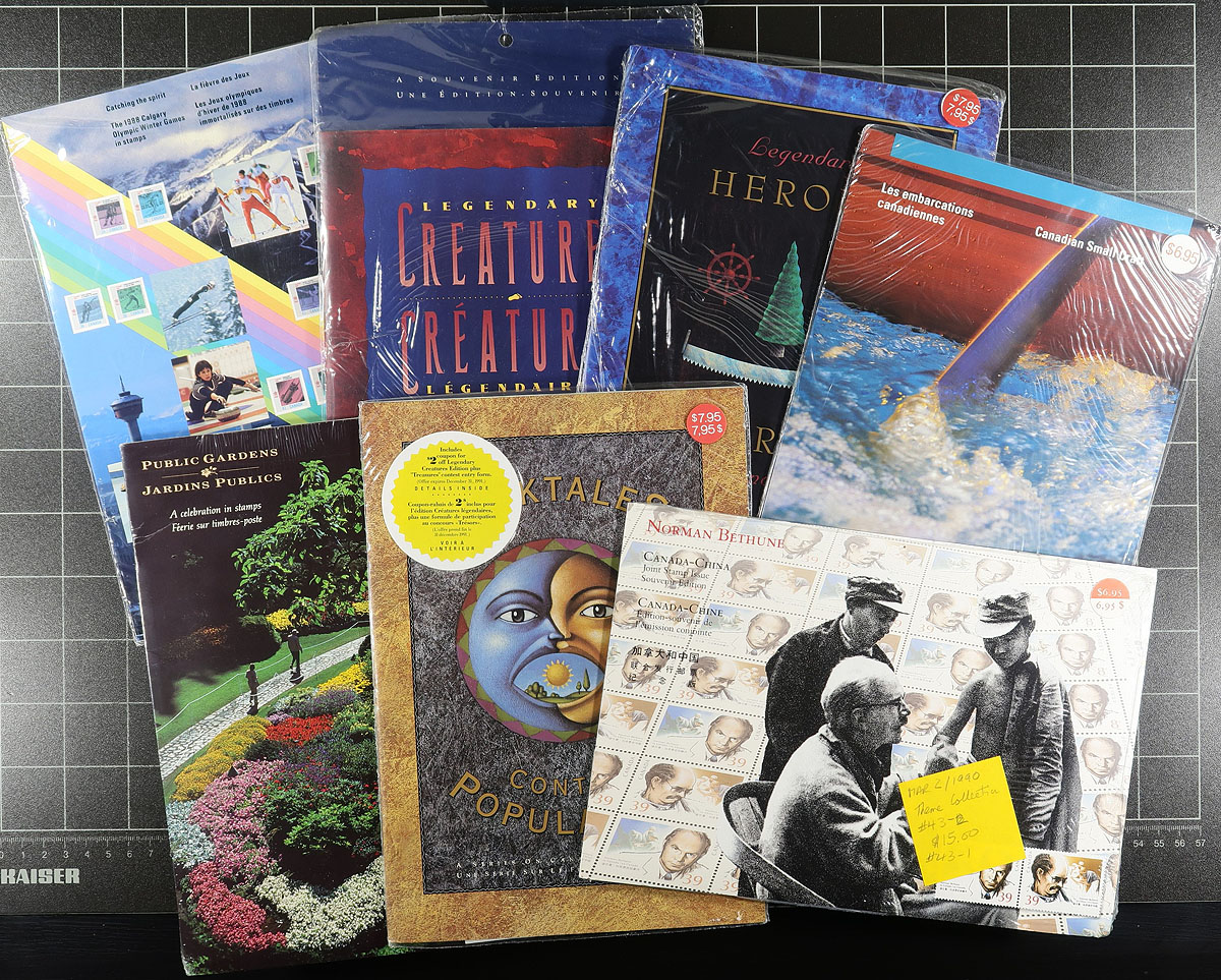 Thematic Collections. Nice group of 48 Thematic collections, 1970-2001, containing Unitrade #s 3-5, 11-15, 17-20, 22, 27 (x2), 28, 29 (x2), 33 (x2), 35 (x2), 36-38, 40-1, 43(x2), 44-47, 49-51, 53-54, 57, 60, 62-63, 66, 72, 78, 98, 103. Almost all of the collections are still in original post office packaging. Clean and very fine. 2025-2026 Unitrade =