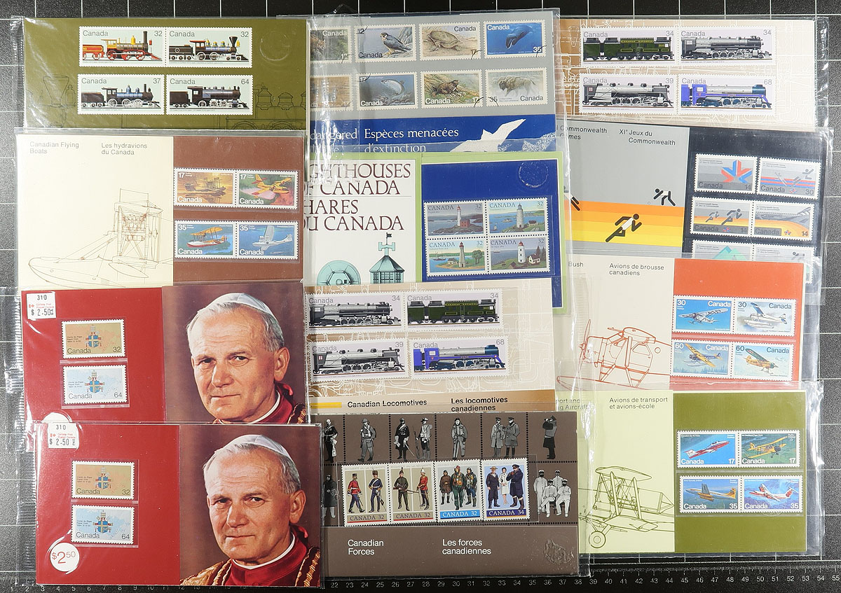 Thematic Collections. Nice group of 48 Thematic collections, 1970-2001, containing Unitrade #s 3-5, 11-15, 17-20, 22, 27 (x2), 28, 29 (x2), 33 (x2), 35 (x2), 36-38, 40-1, 43(x2), 44-47, 49-51, 53-54, 57, 60, 62-63, 66, 72, 78, 98, 103. Almost all of the collections are still in original post office packaging. Clean and very fine. 2025-2026 Unitrade =