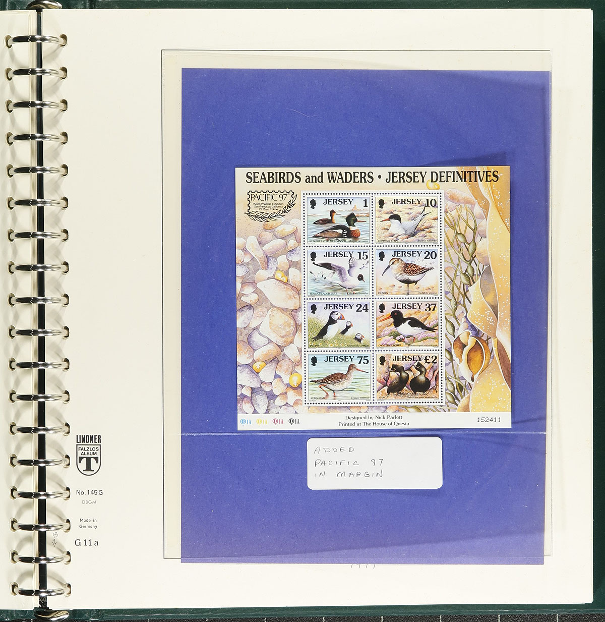 Lovely never hinged collection of modern Jersey, 1991-2014, containing over 900 stamps in thee albums with either stock pages or Lindner hingeless album pages. The collection ranges from Scott #553/1815, containing several sets and souvenir sheets, with strength from 1991-2000 and 2010-2014. A nice lot for collectors and dealers alike. 2026 Scott US$1,568.00 =