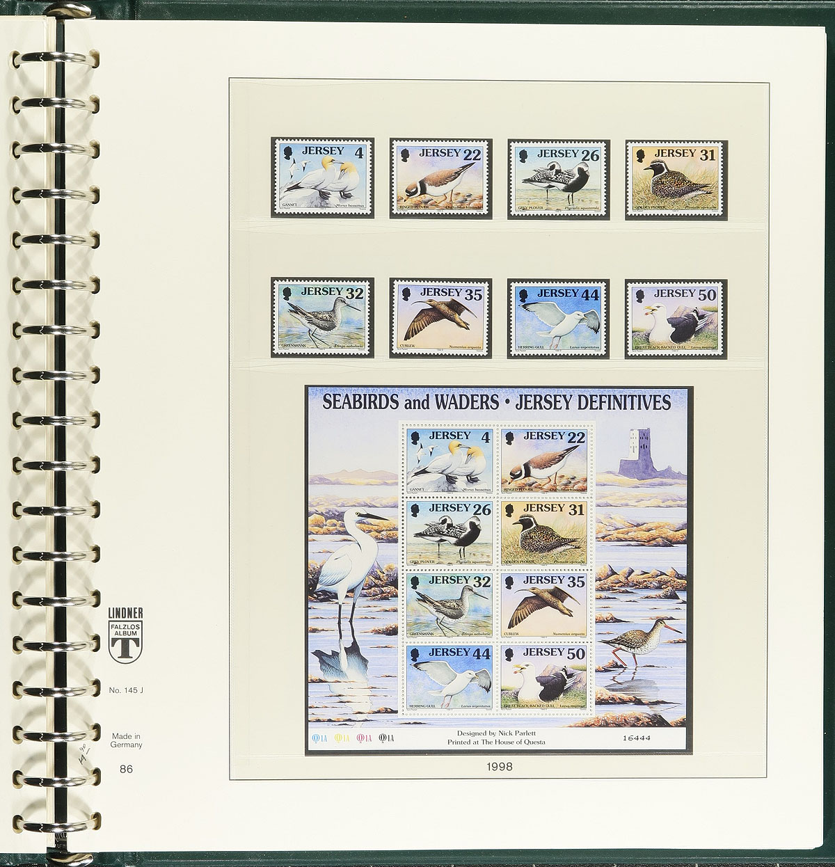 Lovely never hinged collection of modern Jersey, 1991-2014, containing over 900 stamps in thee albums with either stock pages or Lindner hingeless album pages. The collection ranges from Scott #553/1815, containing several sets and souvenir sheets, with strength from 1991-2000 and 2010-2014. A nice lot for collectors and dealers alike. 2026 Scott US$1,568.00 =
