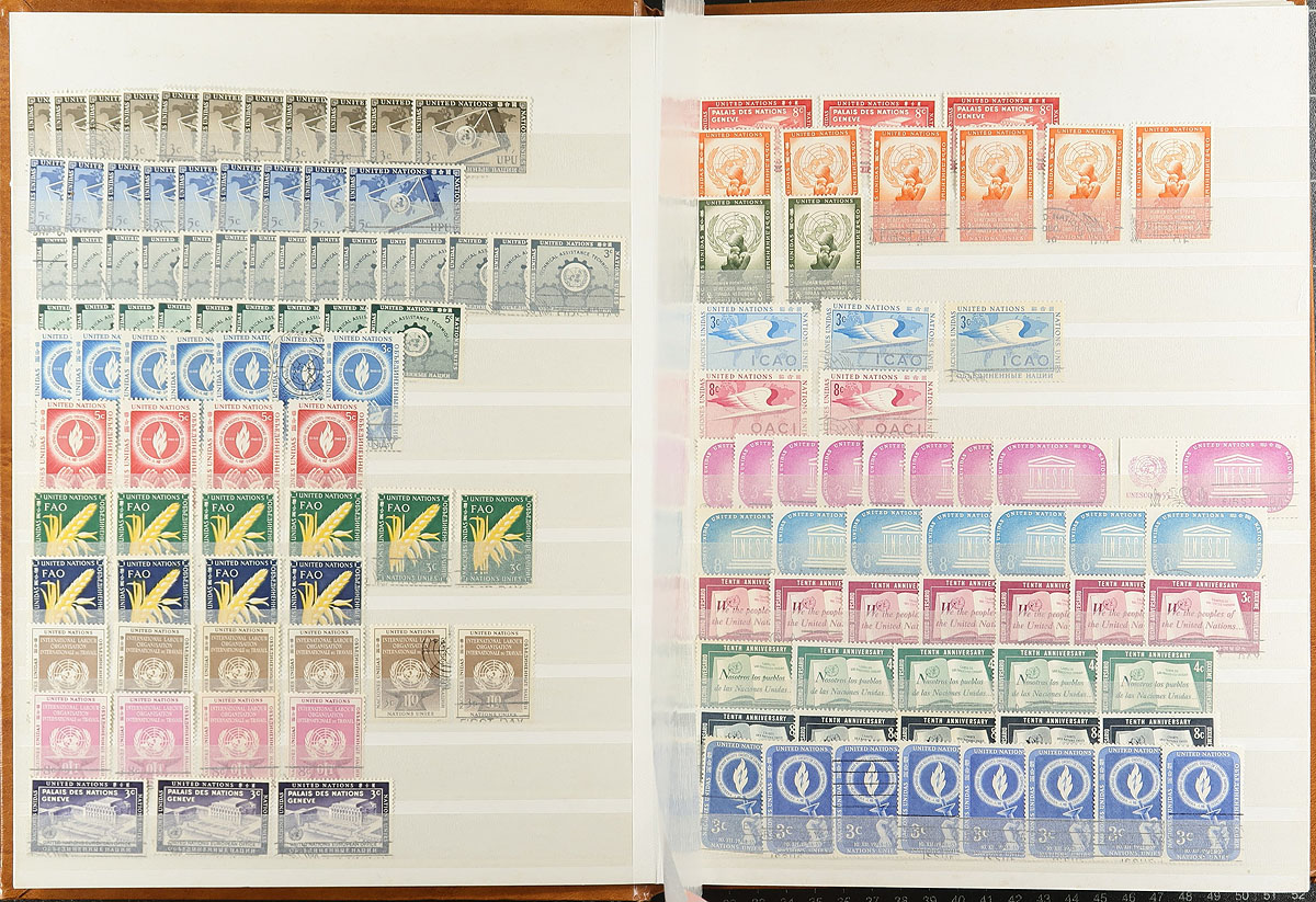 Large group of worldwide material in 6 stockbooks and 4 albums, containing starter collections of Poland, Czechoslovakia, United States, Hungary, and United Nations, along with three worldwide albums containing several hundreds of stamps ranging from the 1890's up to the 1960's (or thereabouts), containing mostly European and British Commonwealth countries. Most of the stamps appear to be used, but did notice some mint stamps scattered throughout. Not checked at all for catalogue values, so could have a few finds. A nice project for the worldwide collector. Estimate =