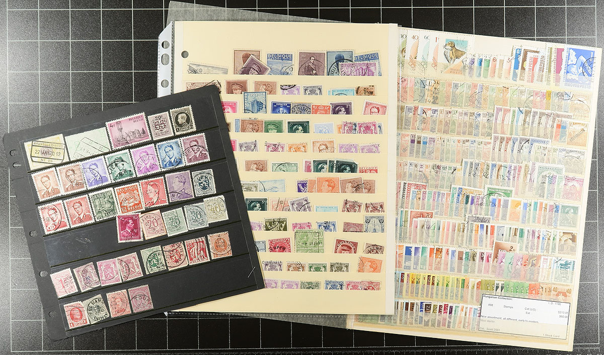 Collections of mint and used worldwide stamps, containing a few thousand stamps in roughly 15 stock or album pages. This is a neat eclectic group noting pages of Belgium, Turkey, Micronesia, Czechoslovakia, Australia, Ireland, and a few other regions, with material generally ranging from the late 1890s to the 1980s. Most of the material has been catalogued by the owner using an older Scott catalogue totalling US$969.00. A nice lot with potential finds for the worldwide collector, overall fine to very fine. Estimate =