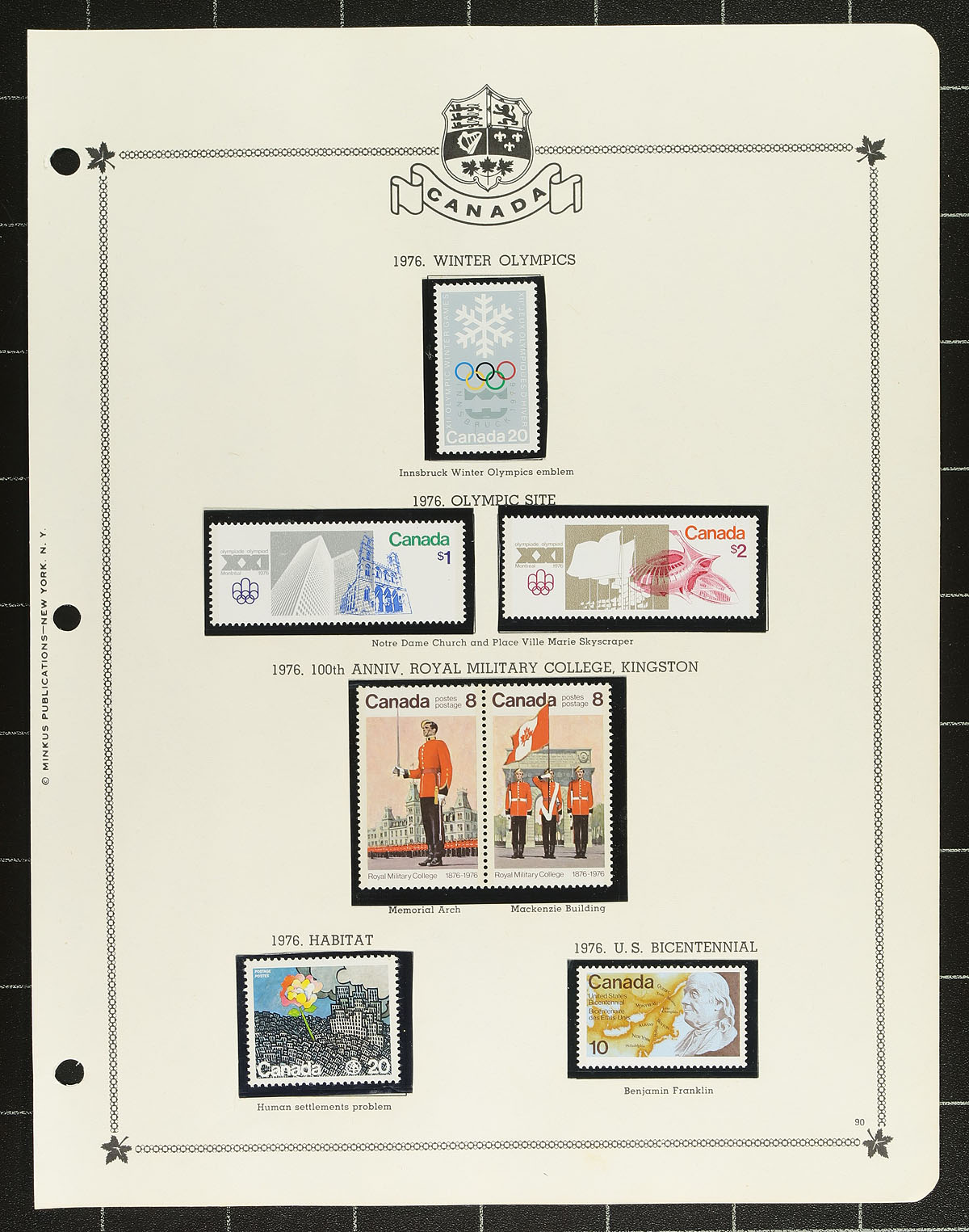 Starter collection of mint and used Canada, 1870's-1983, containing many hundreds of stamps in roughly 100 Minkus album pages. The collection has a little bit of everything, including a few used low denomination Victorian issues, partial sets of Edwards, Quebecs, Admirals, Scrolls (includes a 50c bluenose), all the way to the Peace issues. Mint never hinged material begins in the 1950s up to the 1980s along with a few used stamps, with face value roughly in the $65 to $75 range. The collection also includes a few back of the book stamps, perfins, precancels, and Newfoundland stamps. A nice collection to continue until completion. A few faults with the early issues, overall fine. Estimate =
