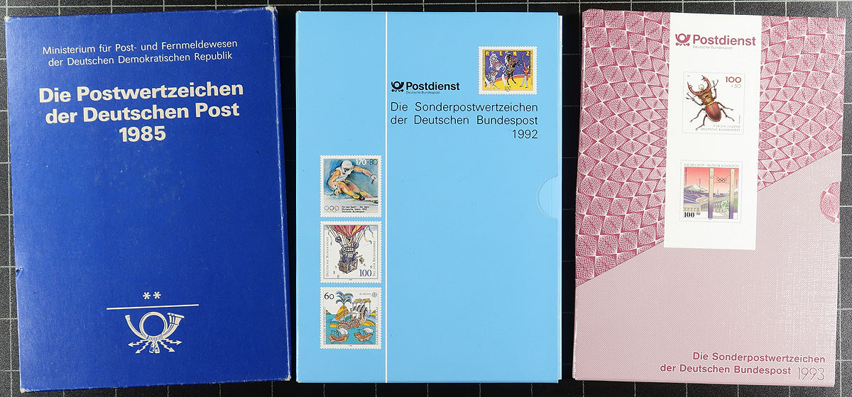Lovely group of 13 annual collections, 1984-1997, containing Germany collections from 1991-1997, and from DDR 1984-1988, 1990. The collections contains singles, sets, souvenir sheets, and some postal stationery, with original retail price in the hundreds of dollars, with current catalogue value surely the same. Clean and very fine. Estimate =