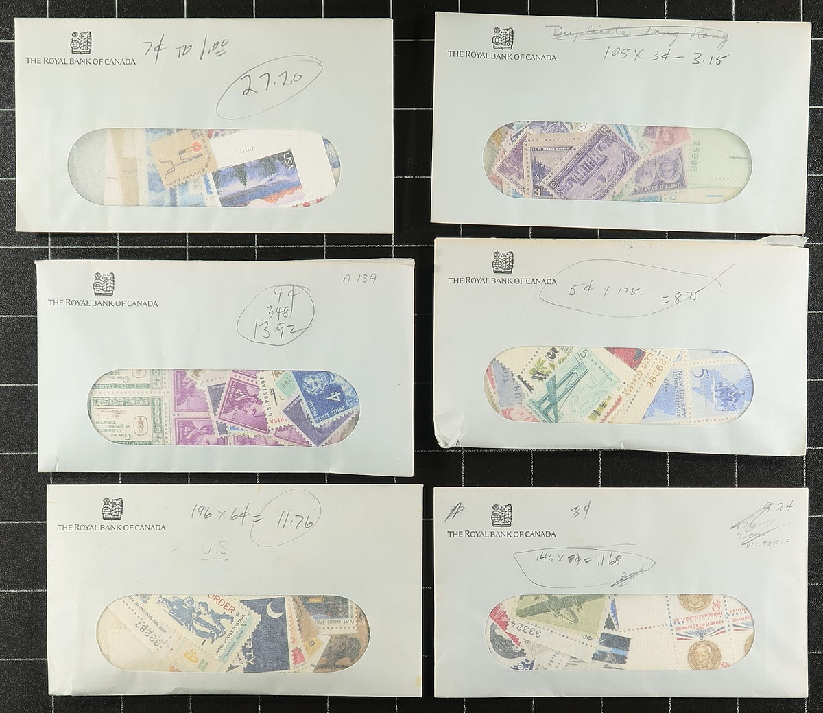 Accumulation never hinged material, including a few thematic collections noting "Legends of the West", "History's Messages Marvels of the Mail", "The Civil War 1861-1865", and "I Have A Dream", along with an accumulation of singles, blocks, coil strips, etc in envelopes, and a stockbook. Face value alone is over US$250.00 ($341.85 CDN). A nice clean lot for collectors, dealers, and postage users. Estimate =