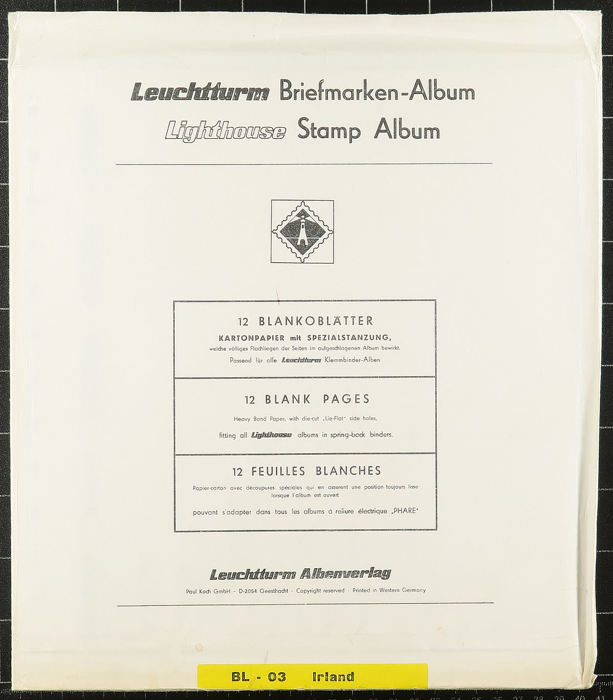 Supplies. Lovely "like new" Lighthouse brand Ireland album with hingeless pages from 1922-1994, all in a turn-post style padded album in dark green, also including blank pages. A lovely album which retails several hundreds of dollars and should be well worth our estimate. Estimate =