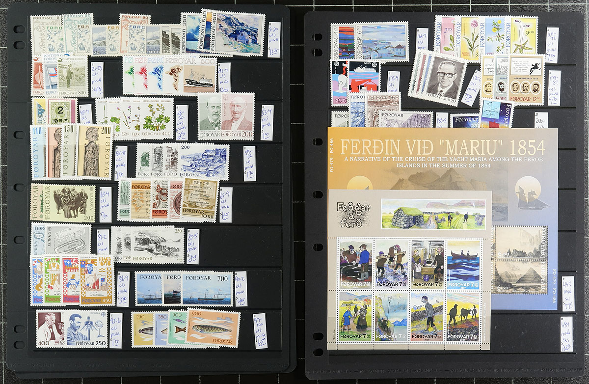 Terrific group of never hinged Faroe Islands, 1975-2011, containing a few hundred stamps in 10 album or stock pages. This nice lot ranges from Scott #7/569a, containing sets, along with several booklets or panes, and souvenir sheets. A spot check indicated items catalogue $10 and up. A nice lot from this very popular collecting country, very fine. Owner's older 2016 Scott US$738.00 =