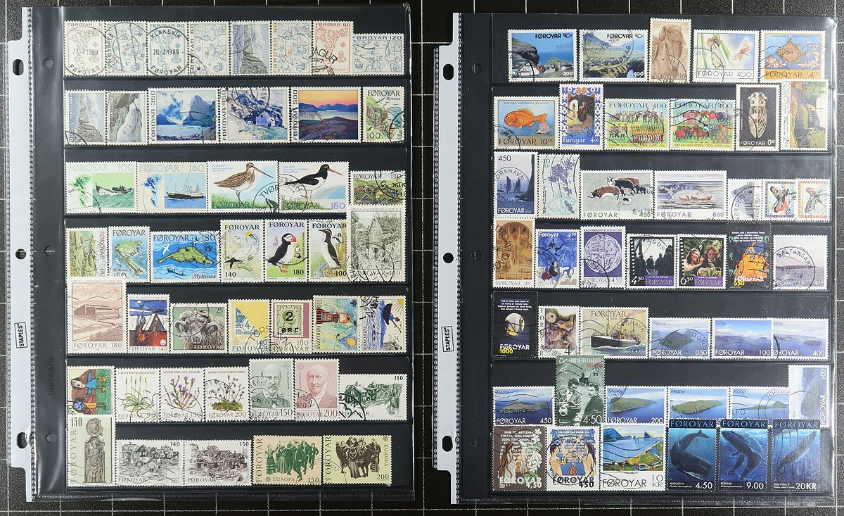Very nice group of used Faroe Islands, 1975-2004, containing a few hundred stamps in roughly 13 stock pages. The lot generally ranges from Scott #7/439, containing singles and a handful of booklets with canceled stamps inside. A spot check indicated some items cataloguing $10 and up. It appears the used stamps have cto cancels, still a clean lot from this popular collecting country. Owner's older 2016 Scott US$885.00 =