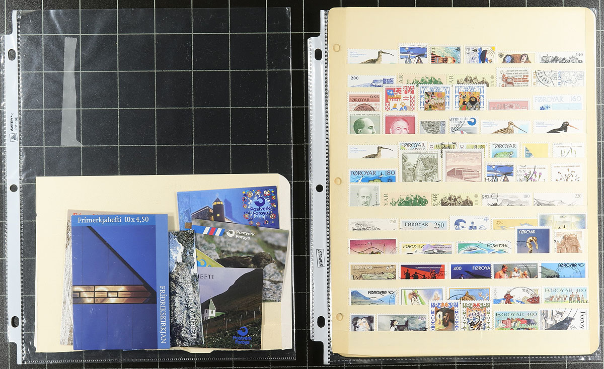 Very nice group of used Faroe Islands, 1975-2004, containing a few hundred stamps in roughly 13 stock pages. The lot generally ranges from Scott #7/439, containing singles and a handful of booklets with canceled stamps inside. A spot check indicated some items cataloguing $10 and up. It appears the used stamps have cto cancels, still a clean lot from this popular collecting country. Owner's older 2016 Scott US$885.00 =
