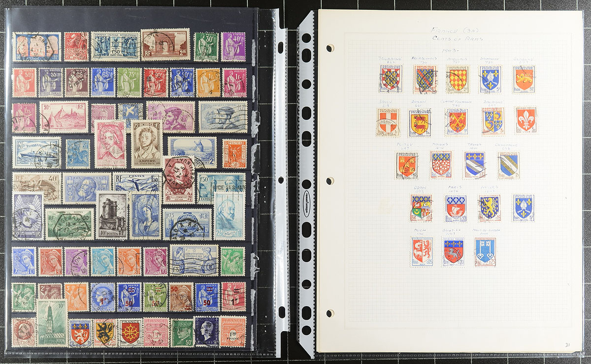 Accumulation of used France, 1854-1980's, containing roughly 1,000 in a handful of stock or album pages. The lot generally ranges from Scott #15/2038, containing several classic singles, along with semi-postals and airmail issues. A spot check indicated a few items cataloguing $10 to $15 and up each. A nice starter lot from this popular collecting country, a few faults with a few of the early issues, overall fine to very fine. Owner's older 2017 Scott US$720.00 =