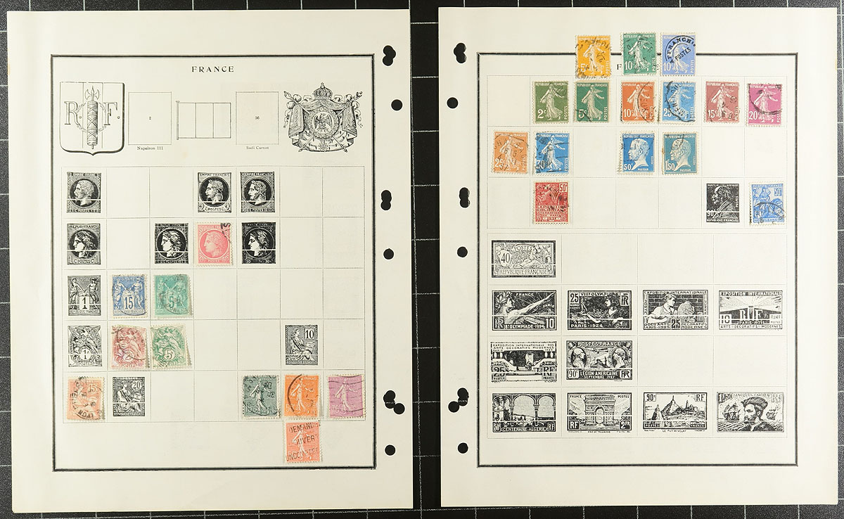 Accumulation of used France, 1854-1980's, containing roughly 1,000 in a handful of stock or album pages. The lot generally ranges from Scott #15/2038, containing several classic singles, along with semi-postals and airmail issues. A spot check indicated a few items cataloguing $10 to $15 and up each. A nice starter lot from this popular collecting country, a few faults with a few of the early issues, overall fine to very fine. Owner's older 2017 Scott US$720.00 =