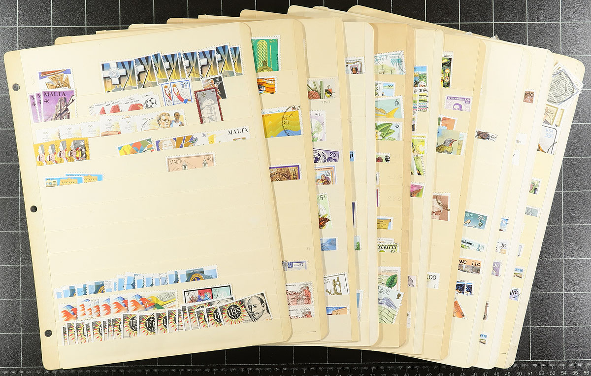 Accumulation of many thousands of stamps filling a bankers box. We note a wide variety of material within, mainly in manila or album pages, along with glassines, few albums, baggies, and more. The majority of material appears to be European in nature (including some pre-1900 France), along with South America, and more, generally ranging from 1900 onwards. A nice project for the worldwide collector, with potential finds possible. Overall fine to very fine. Estimate =
