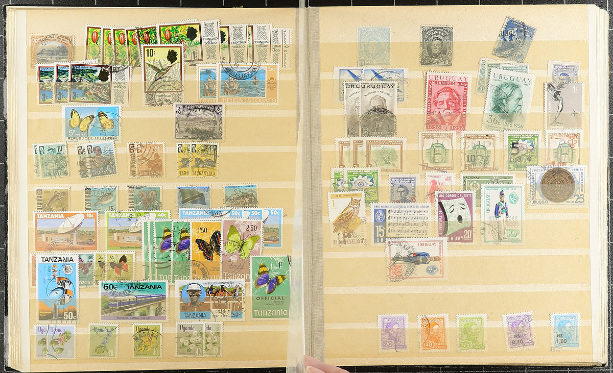 Accumulation of many thousands of stamps filling a bankers box. We note a wide variety of material within, mainly in manila or album pages, along with glassines, few albums, baggies, and more. The majority of material appears to be European in nature (including some pre-1900 France), along with South America, and more, generally ranging from 1900 onwards. A nice project for the worldwide collector, with potential finds possible. Overall fine to very fine. Estimate =