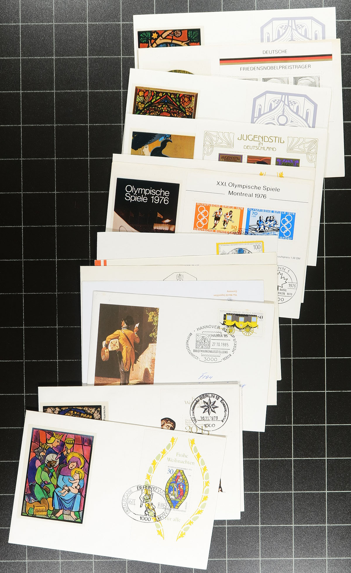 Lovely group of roughly 300 first day covers with 'Folio-print' type cachets, 1972-1977, noting singles, sets, semi-postal, souvenir sheet, and other frankings. A great lot for the topical or thematic collector as the cachets really illustrate the given stamp subject. Owner's older Michel catalogue values the lot in the several hundred Euros. A very nice lot. Estimate =
