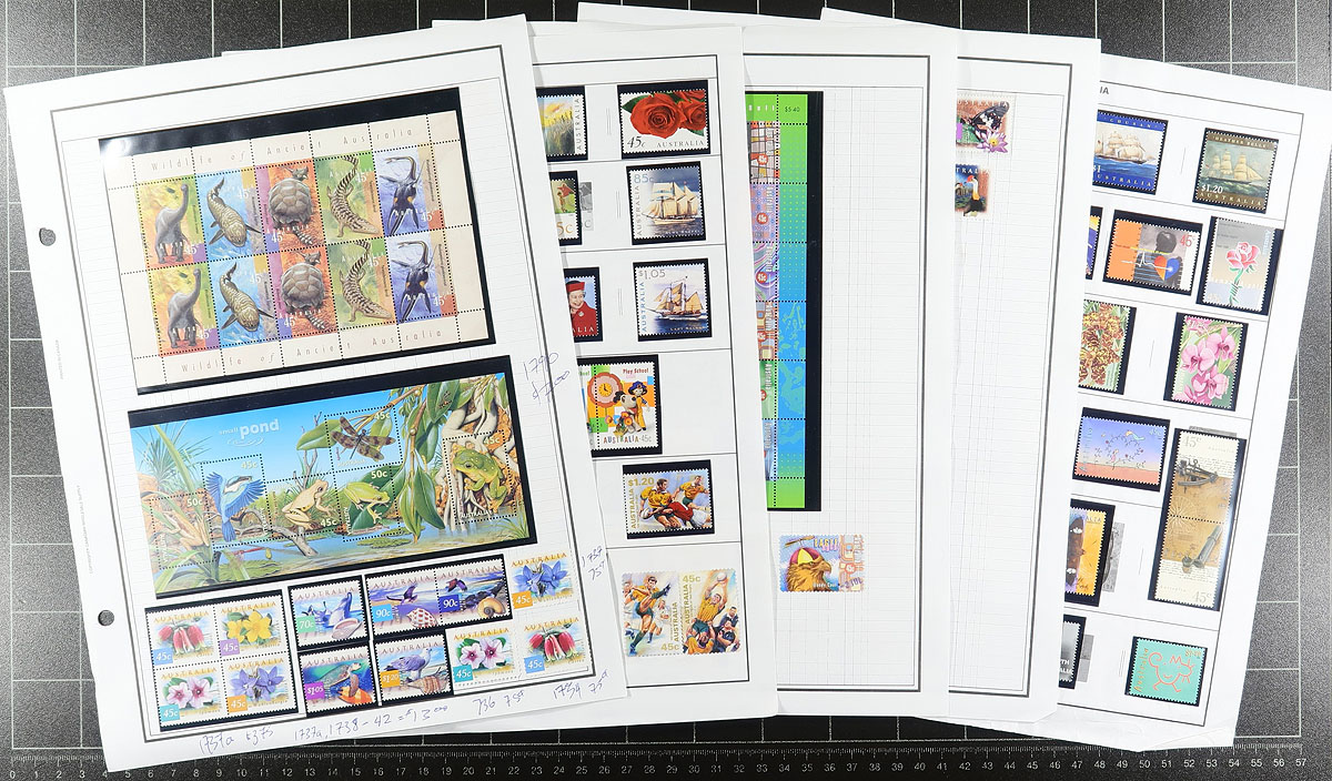 Nice collection of used and never hinged Australia, 1913-2004, containing over 1,000 stamps in roughly 100 album or stock pages. The collection generally ranges from Scott #1/2357, containing singles, sets, booklets and booklet panes, with the collection essentially being in two halves. The first part is a primarily never hinged collection from 1969 to 2004 (mostly in hingeless mounts), in roughly 75 album pages, with the second part being a used collection containing a few Kangaroos up to the 1980's. A nice collection for all collectors as we suspect not only a high catalogue value, but face value in the hundreds of dollars alone. A nice collection, overall fine to very fine. Estimate =