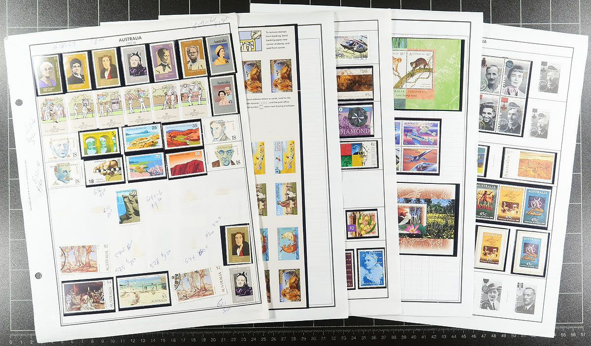 Nice collection of used and never hinged Australia, 1913-2004, containing over 1,000 stamps in roughly 100 album or stock pages. The collection generally ranges from Scott #1/2357, containing singles, sets, booklets and booklet panes, with the collection essentially being in two halves. The first part is a primarily never hinged collection from 1969 to 2004 (mostly in hingeless mounts), in roughly 75 album pages, with the second part being a used collection containing a few Kangaroos up to the 1980's. A nice collection for all collectors as we suspect not only a high catalogue value, but face value in the hundreds of dollars alone. A nice collection, overall fine to very fine. Estimate =