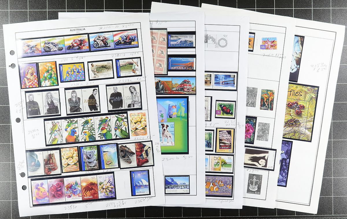 Nice collection of used and never hinged Australia, 1913-2004, containing over 1,000 stamps in roughly 100 album or stock pages. The collection generally ranges from Scott #1/2357, containing singles, sets, booklets and booklet panes, with the collection essentially being in two halves. The first part is a primarily never hinged collection from 1969 to 2004 (mostly in hingeless mounts), in roughly 75 album pages, with the second part being a used collection containing a few Kangaroos up to the 1980's. A nice collection for all collectors as we suspect not only a high catalogue value, but face value in the hundreds of dollars alone. A nice collection, overall fine to very fine. Estimate =