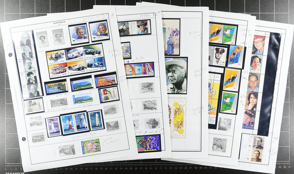 Nice collection of used and never hinged Australia, 1913-2004, containing over 1,000 stamps in roughly 100 album or stock pages. The collection generally ranges from Scott #1/2357, containing singles, sets, booklets and booklet panes, with the collection essentially being in two halves. The first part is a primarily never hinged collection from 1969 to 2004 (mostly in hingeless mounts), in roughly 75 album pages, with the second part being a used collection containing a few Kangaroos up to the 1980's. A nice collection for all collectors as we suspect not only a high catalogue value, but face value in the hundreds of dollars alone. A nice collection, overall fine to very fine. Estimate =
