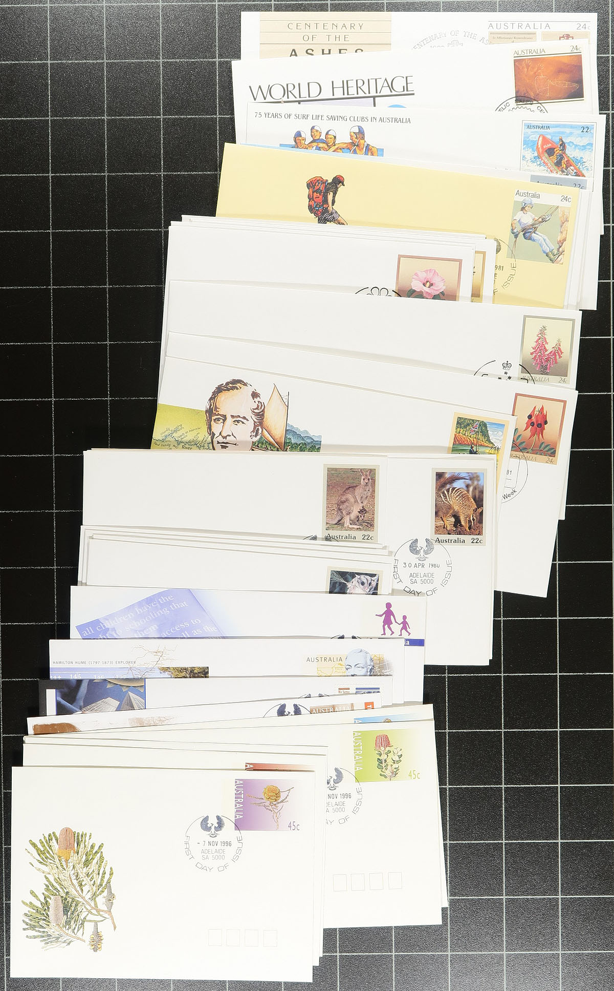Clean collection of roughly 250 Australia postal stationery with first day cancels, 1980-1997, mostly cacheted and unaddressed and postmarked with the regular Adelaide datestamp along with a few special commemorative cancels. Also includes 5 different Frama-franked cacheted first day covers, as well as 14 different freight link Adelaide to Darwin unaddressed covers. Clean and very fine for the postal stationery specialist. Estimate =